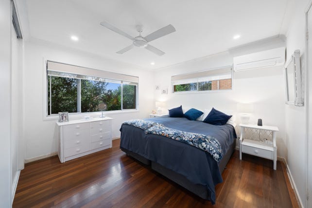 > The primary bedroom features air conditioning, rich timber flooring, sliding windows with fly screens, ceiling fan, built-in wardrobe, downlighting and roller blinds.