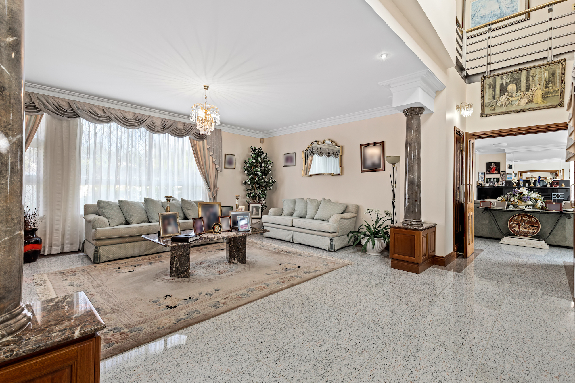 Upon entry, you are greeted by a majestic marble staircase leading to the first story. The lower story also comprises a large study/office, cellar with cool room, sixth bathroom, generous storage room and three car garage.
