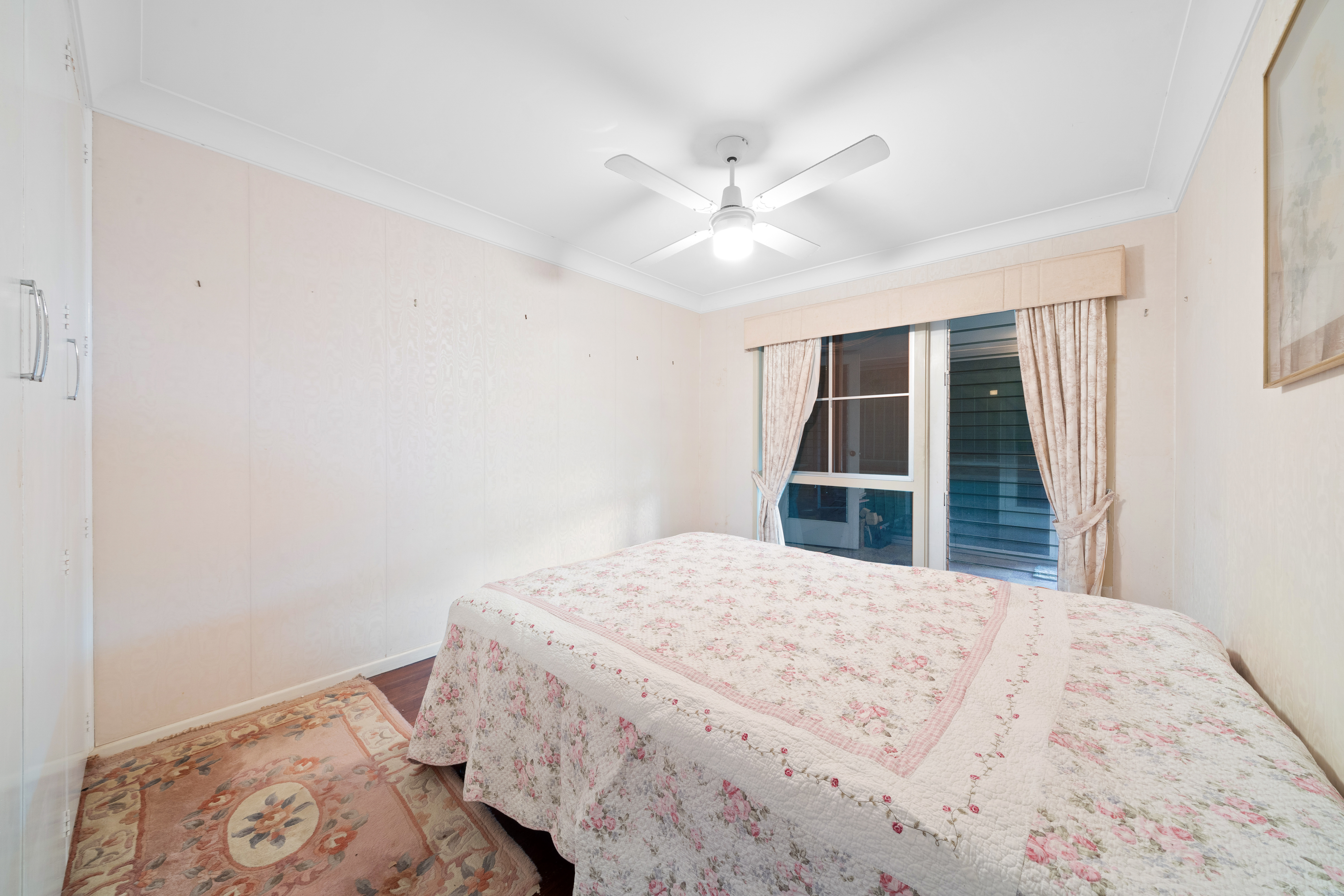 > Bedroom 2 features rich timber flooring, a ceiling fan with lighting, a built-in wardrobe, and a large glass door providing access to the enclosed balcony.