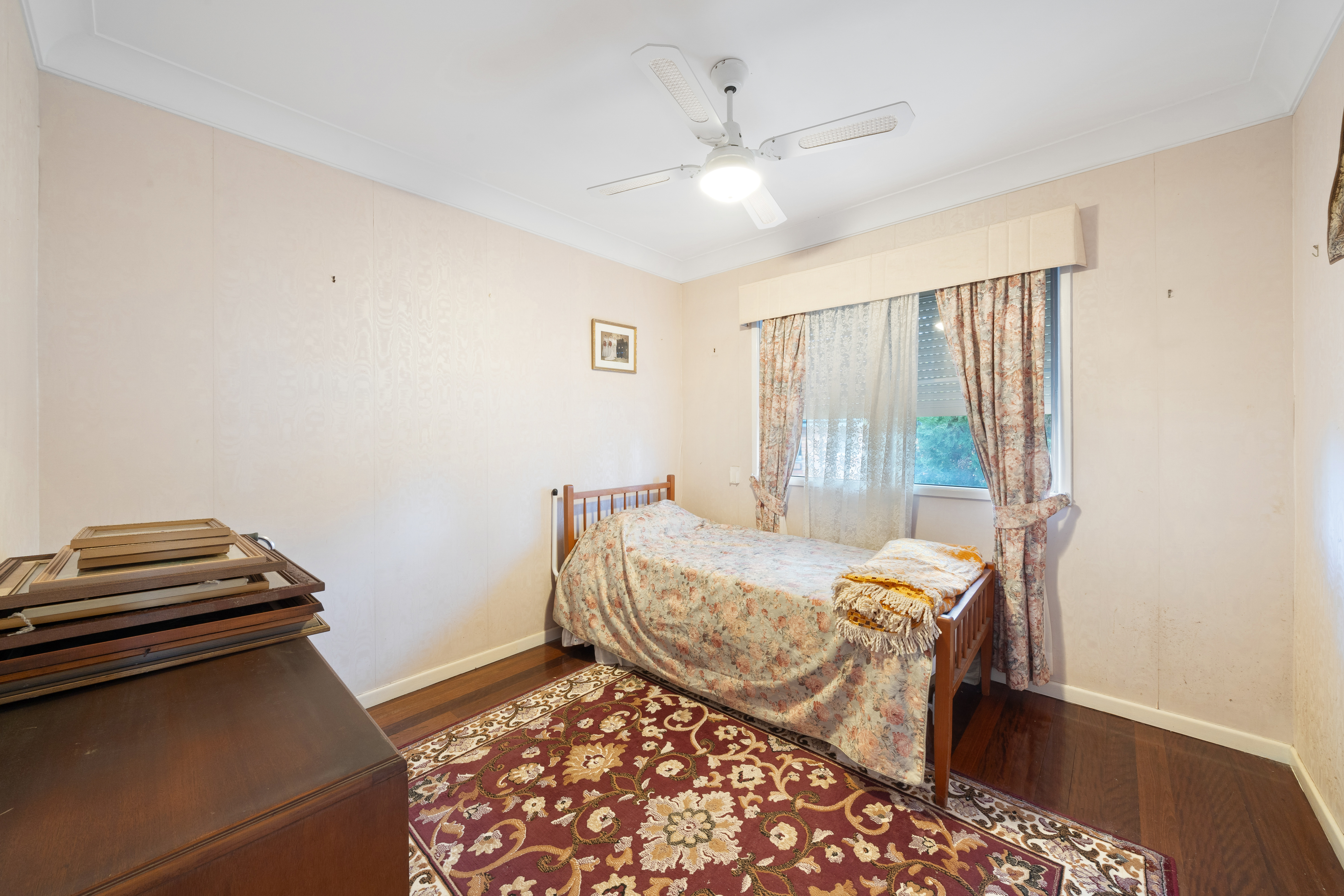 > Bedroom 4 features rich timber flooring, a ceiling fan with lighting, and sliding windows with curtains. > Bedroom 5, located downstairs, features an ensuite, carpet flooring, sliding windows, security bars, pendant lighting, and access to the under-stairs storage.