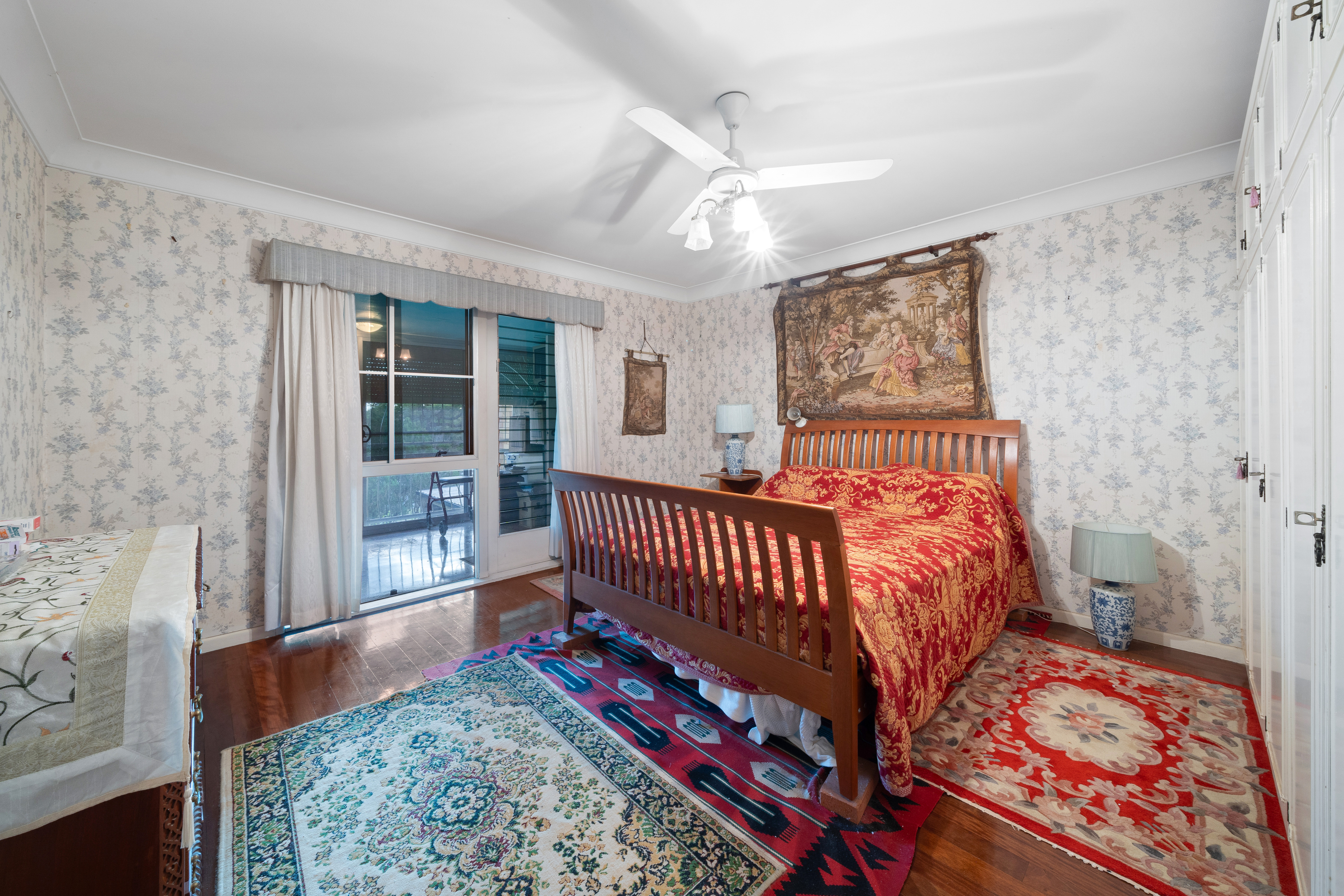 - 6 Bedrooms: > The master bedroom features rich timber flooring, a ceiling fan with lighting, a built-in wardrobe, and a large glass door providing access to the enclosed balcony.