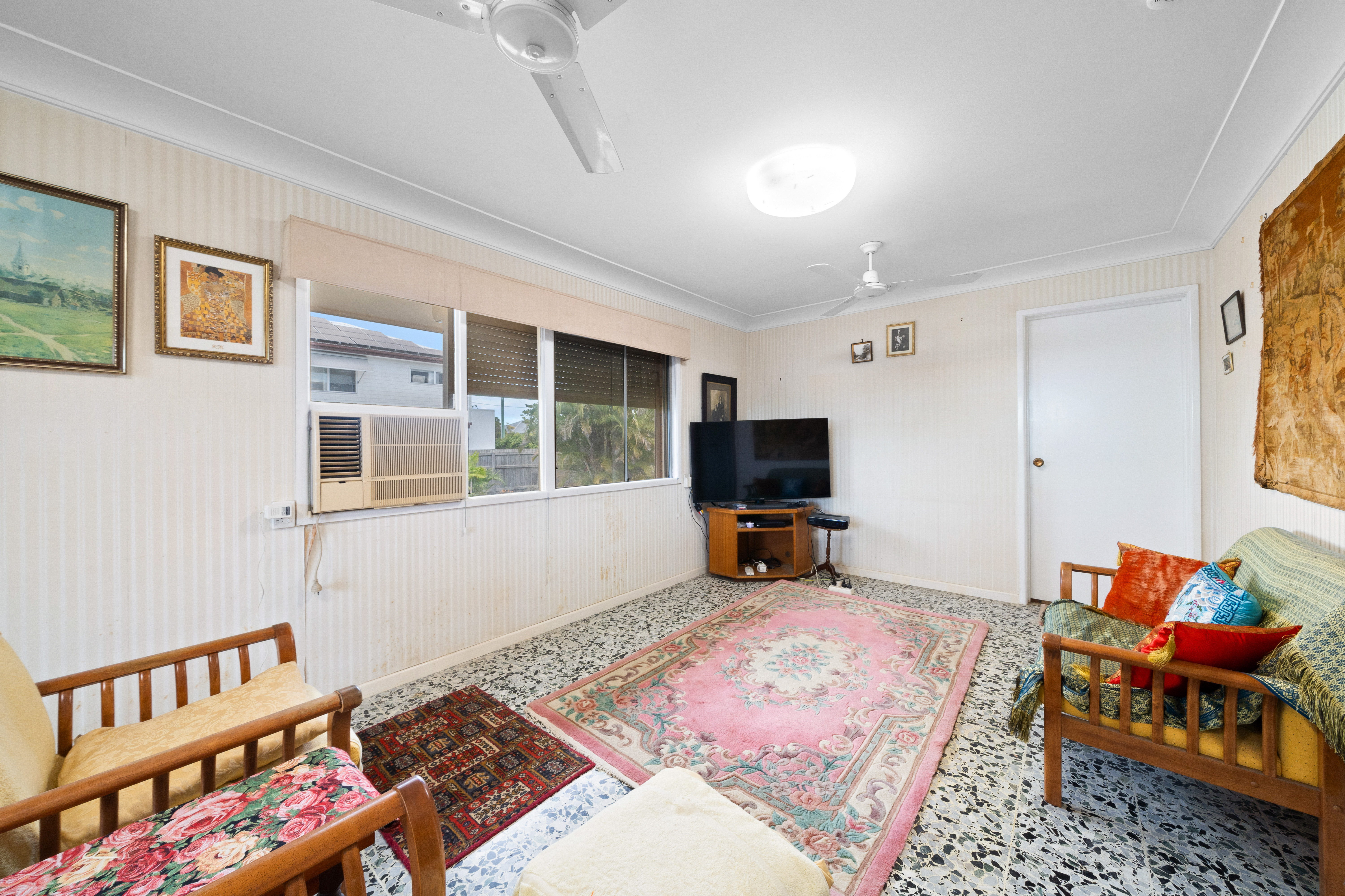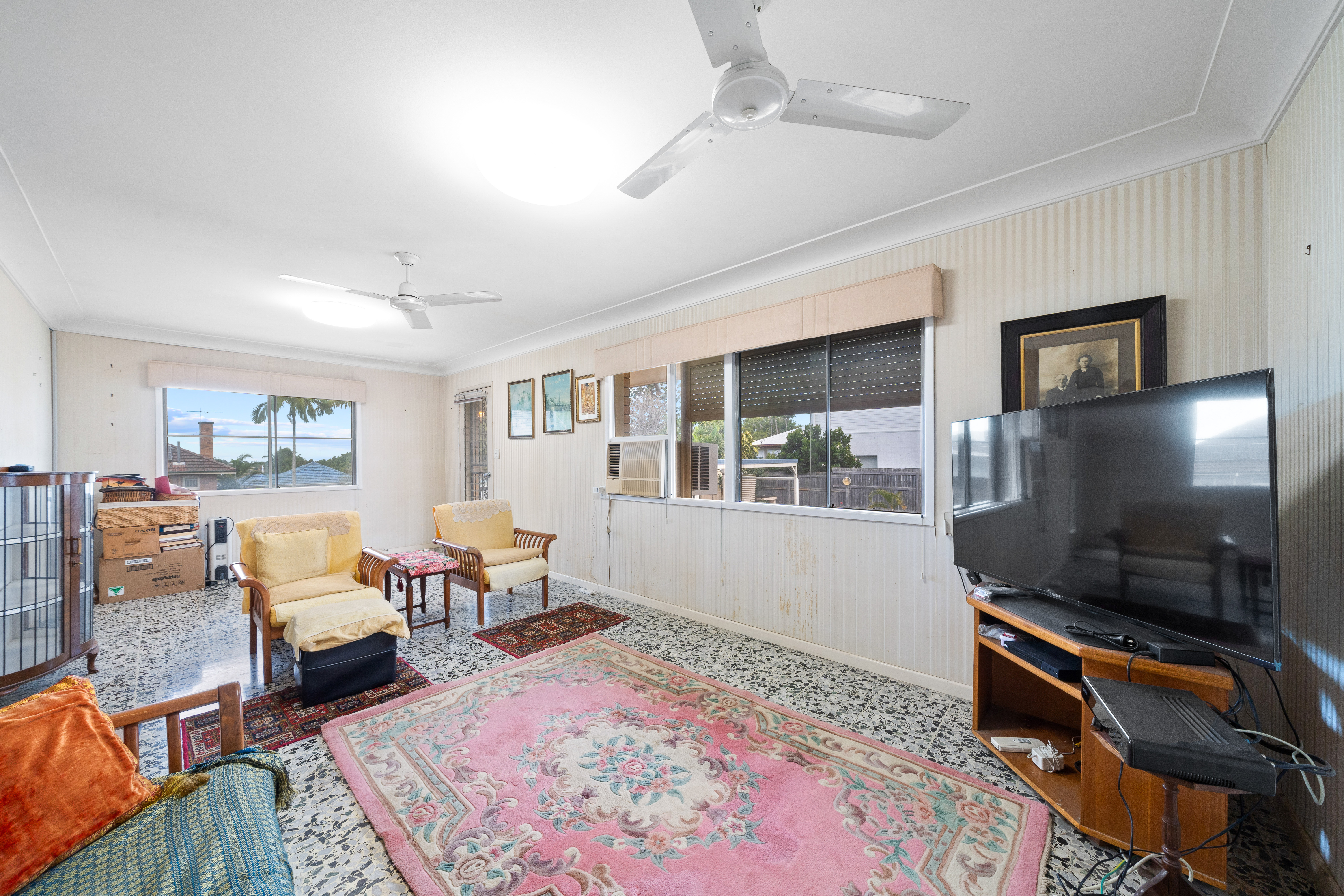 - A multitude of living spaces: > Located on the top level of the property is the lounge room, featuring carpet flooring, pendant and sconce lighting, double ceiling fans, sliding windows, and a built-in storage wall providing access to the dining area and the front sunroom.