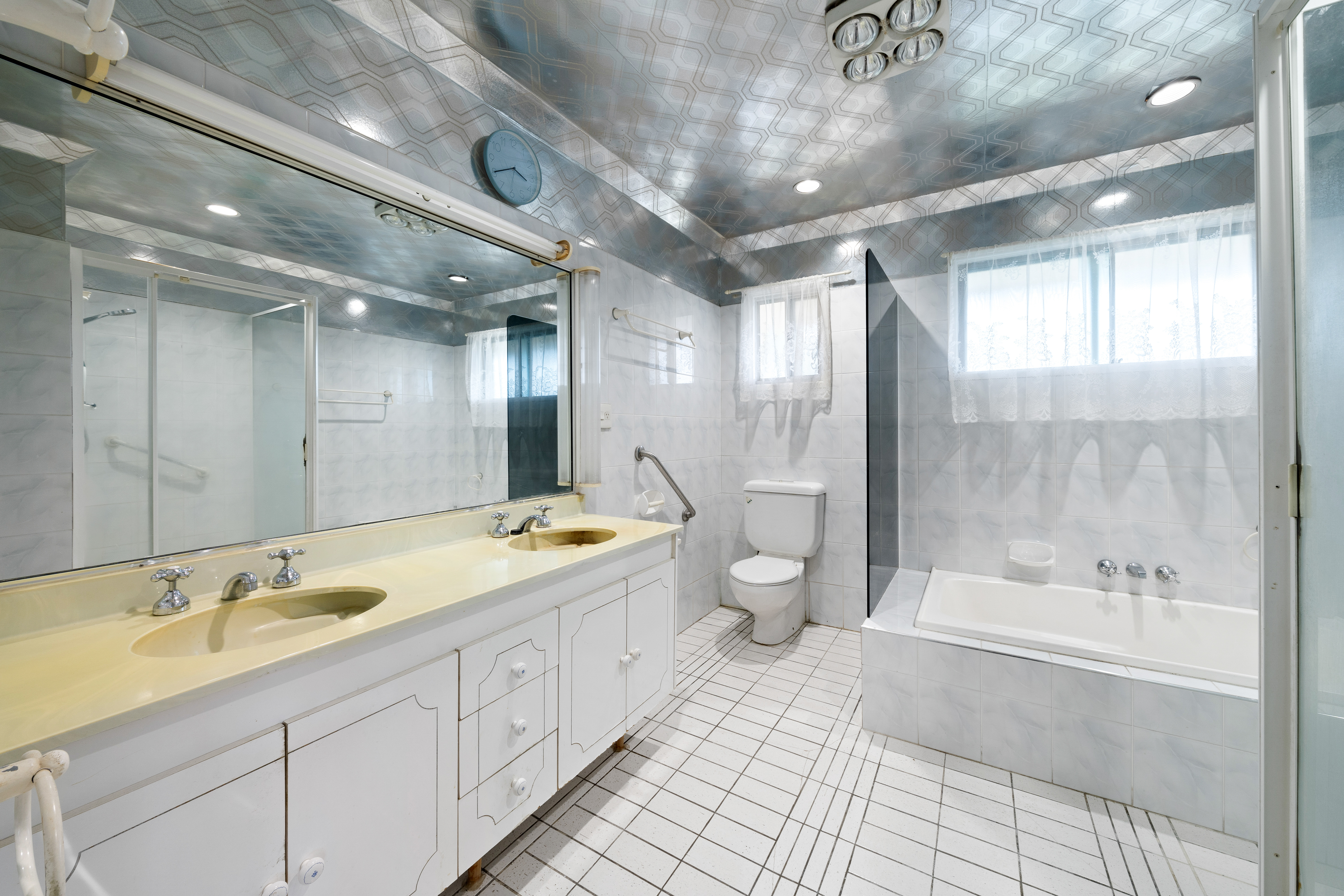 - 3 bathrooms: > The main bathroom, located on the top level, features a large shower with a detachable showerhead, a separate bath, a large double-basin vanity with a large mirror, a heater/extractor/light combo, grab rails, and a toilet.