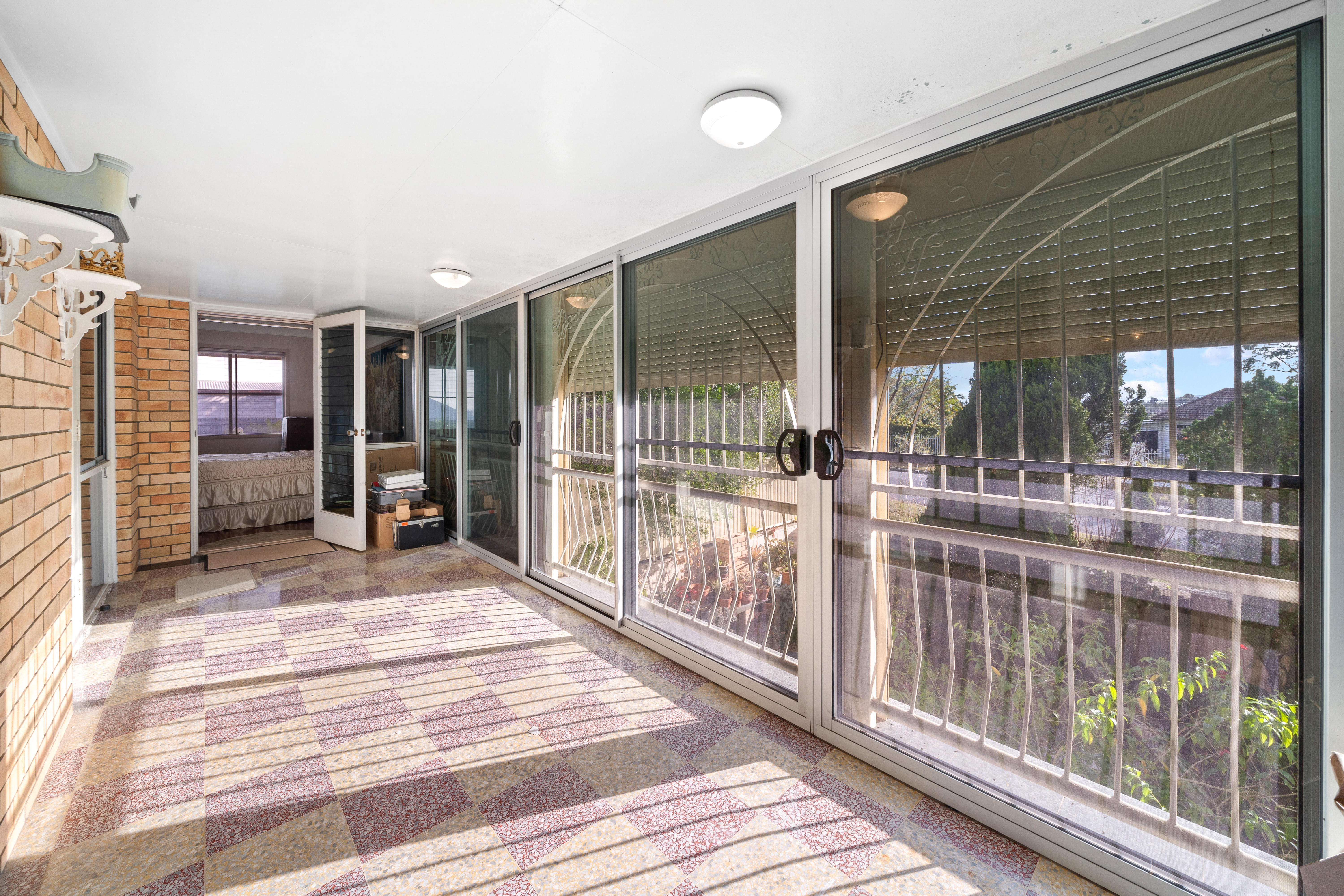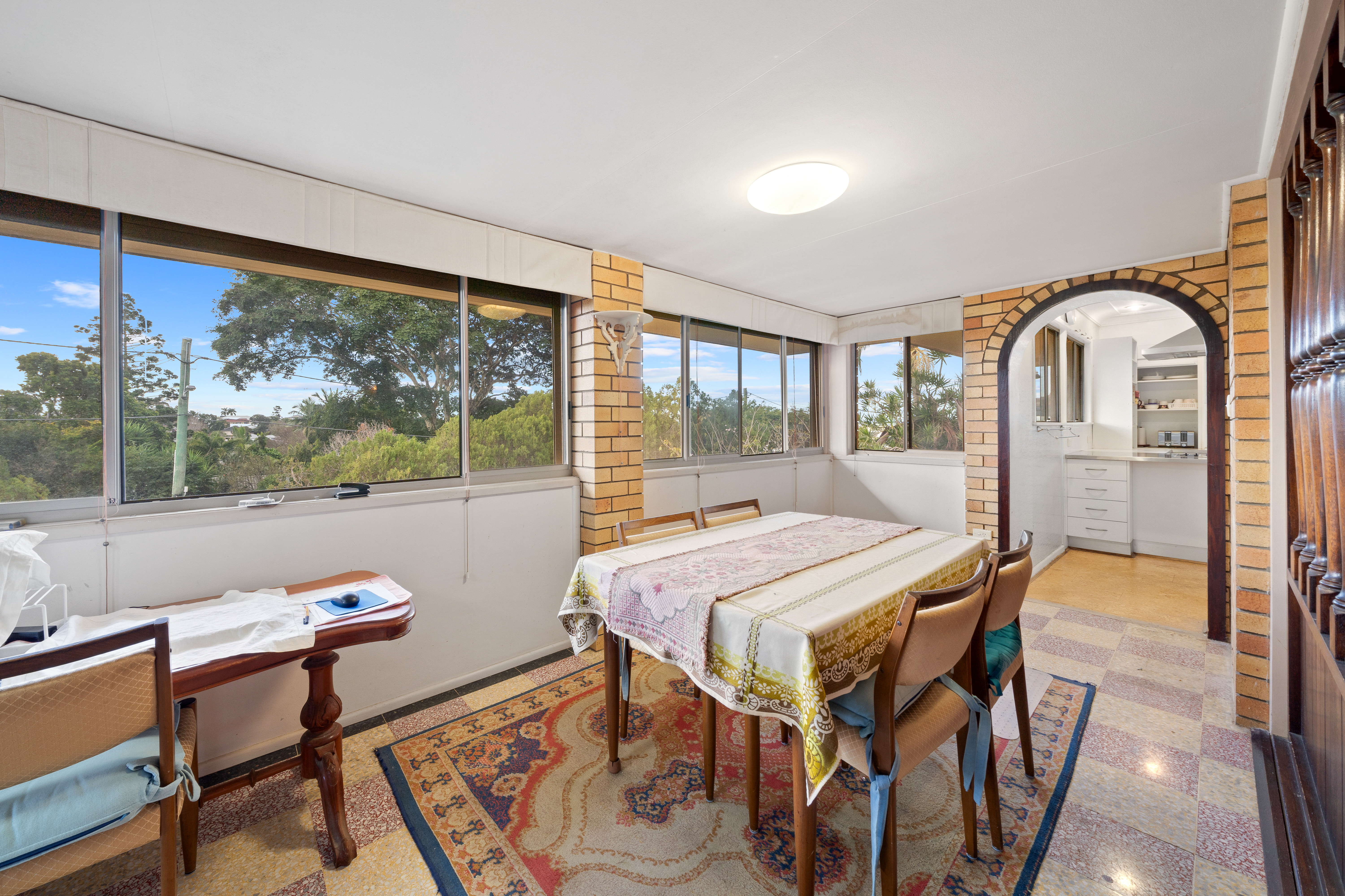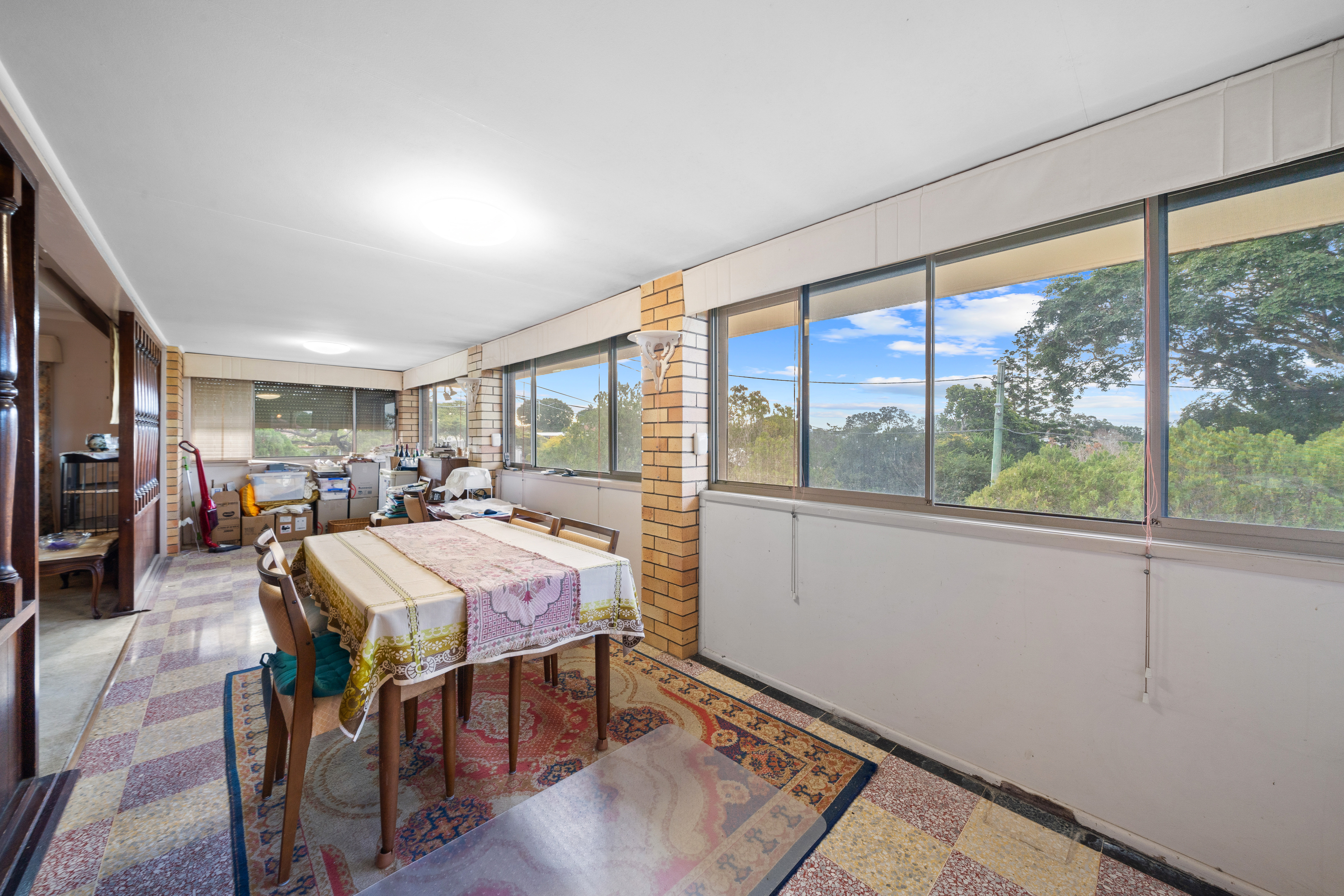 > Located just off the lounge is the dining room, featuring carpet flooring, pendant lighting, and sliding windows. > Located just off the lounge is the sunroom, boasting glimpses of Moreton Island, terrazzo flooring, sliding windows, and oyster lighting. > Located on the entry level is the large rumpus room, boasting a built-in bar, built-in cupboards, sealed flooring, sliding windows with vertical blinds, and access to the enclosed patio and yard. > Located on the top level is an enclosed balcony with large glass sliding doors, capturing cool sea breezes. > Located on the entry level is an enclosed patio with a large louvre wall and a security gate, providing access to the yard.