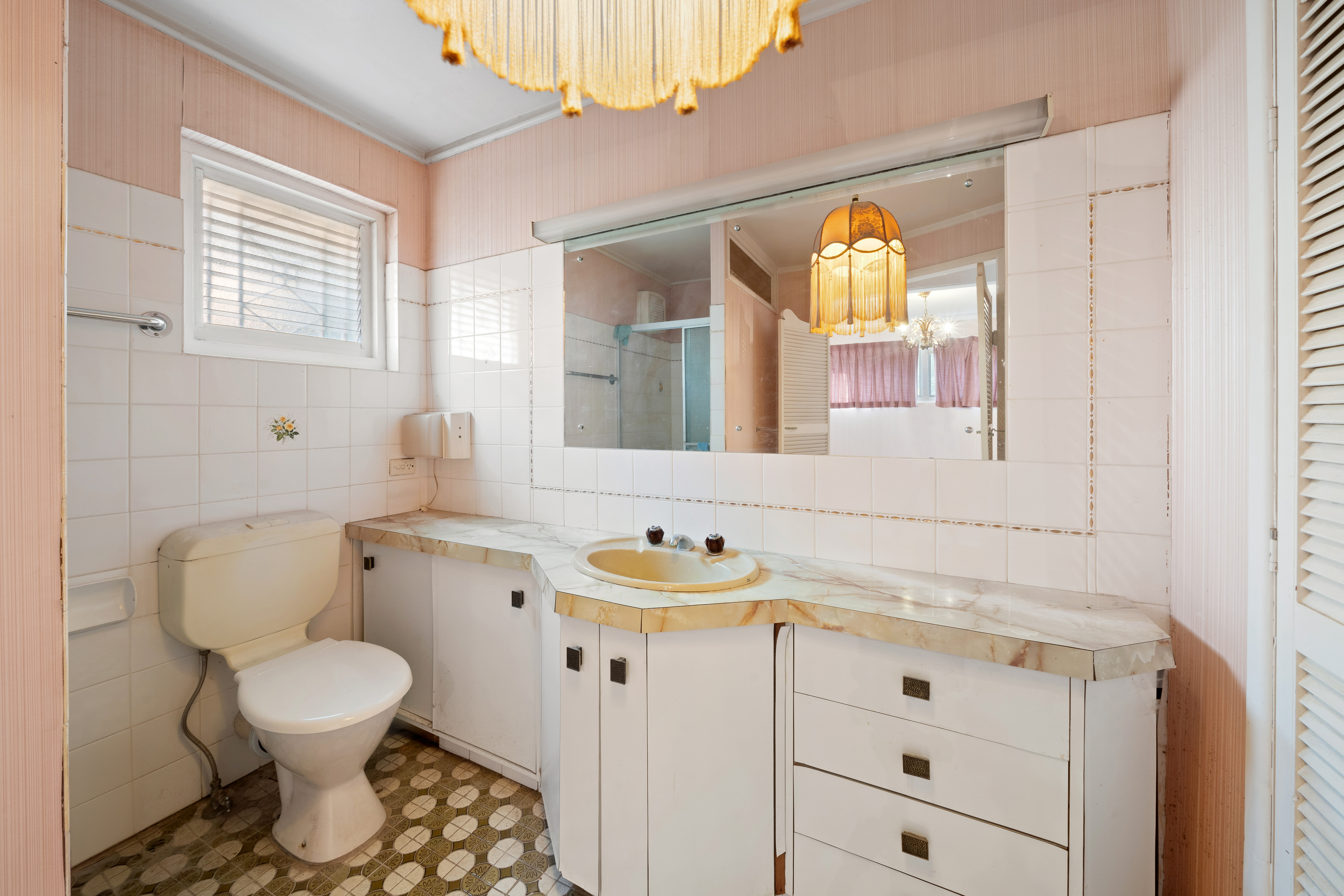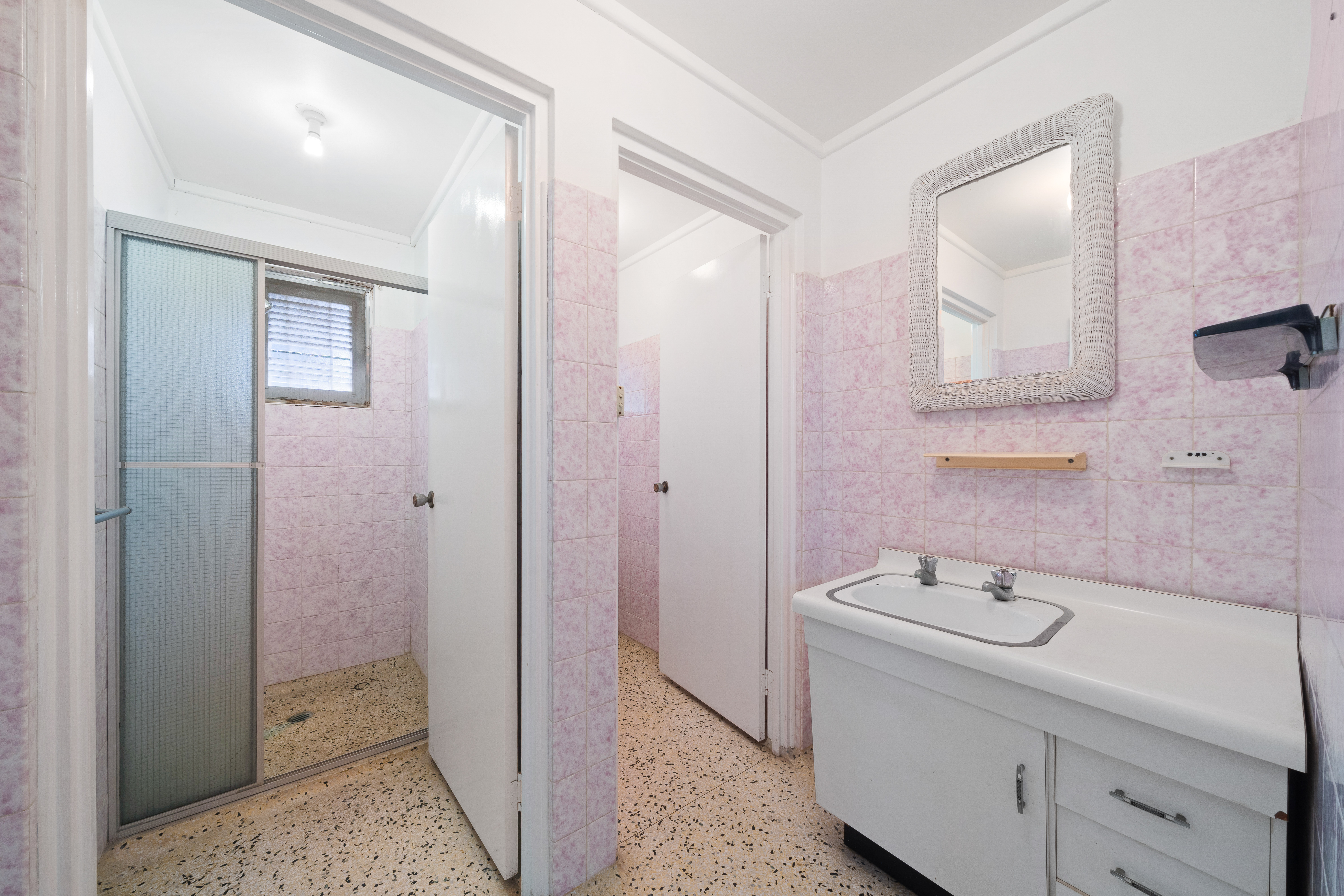 > The ensuite to Bedroom 5 features a shower, a large single-basin vanity with plenty of storage, a towel rack, a large vanity mirror, an extractor fan, pendant lighting, a large cupboard, and a toilet. > Bathroom 3, located downstairs, features a separate shower, a towel rack, a single-basin vanity with a mirror, terrazzo flooring, and a separate toilet.