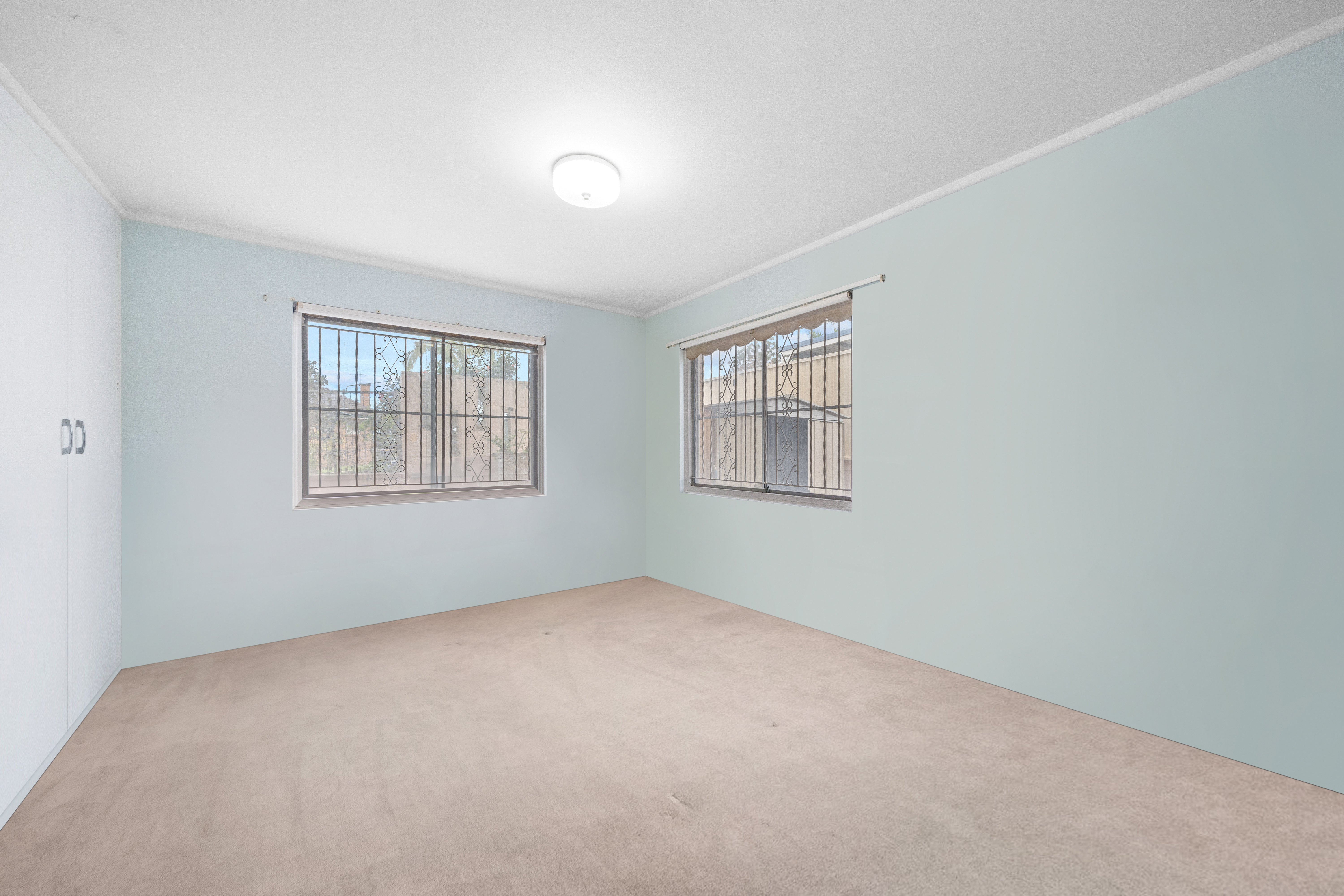 > Bedroom 6, located downstairs, features carpet flooring, sliding windows, security bars, standard lighting, and a built-in robe.