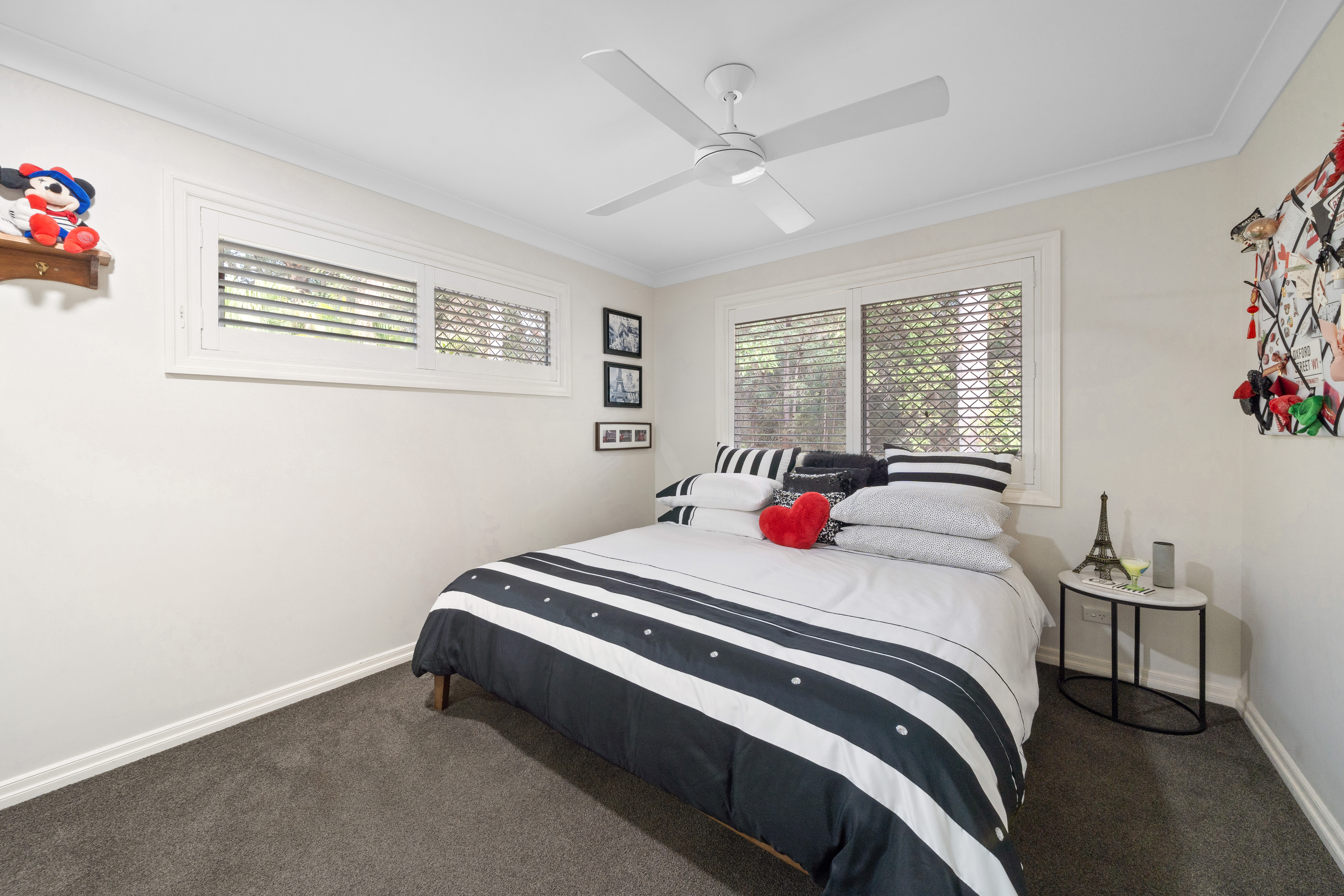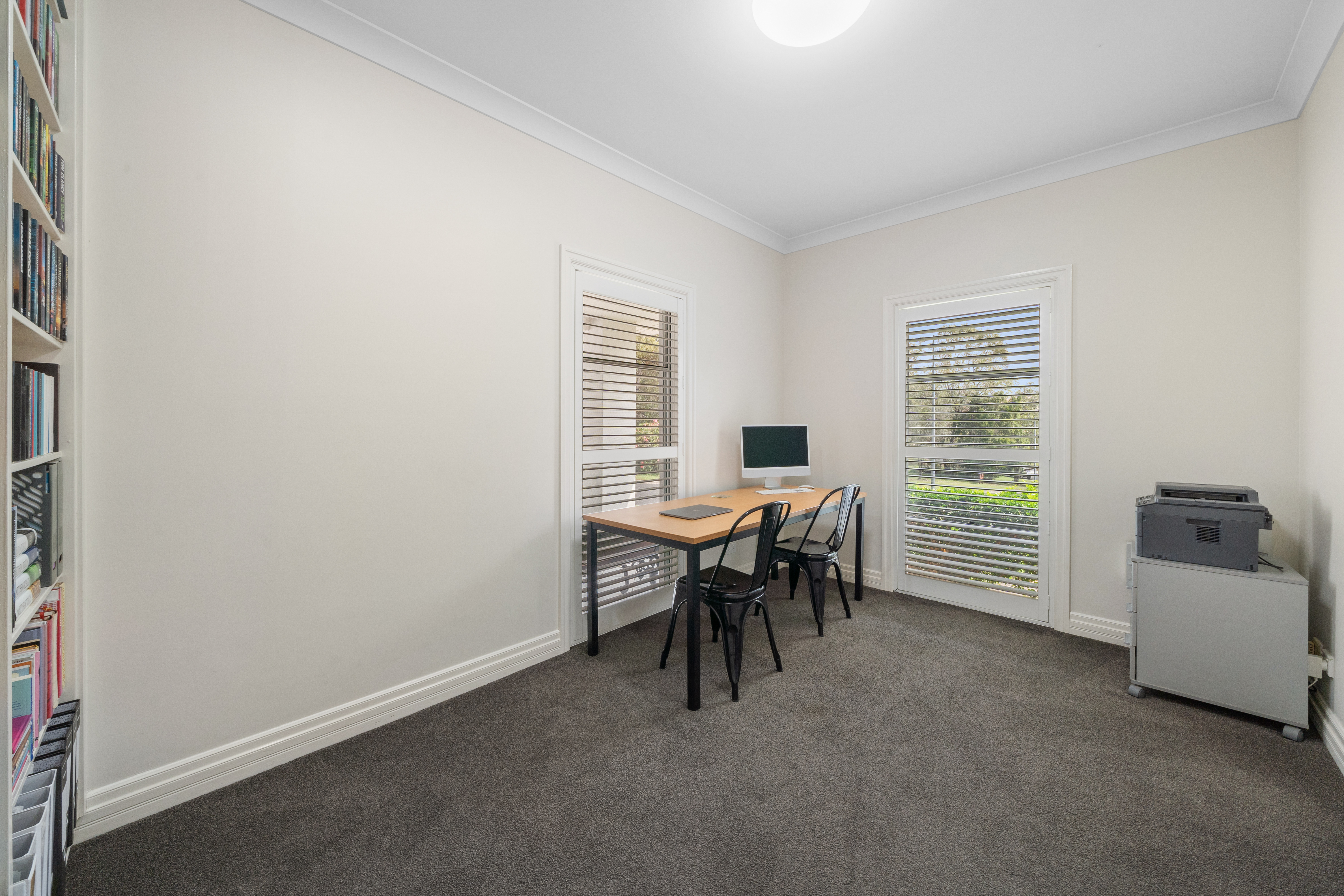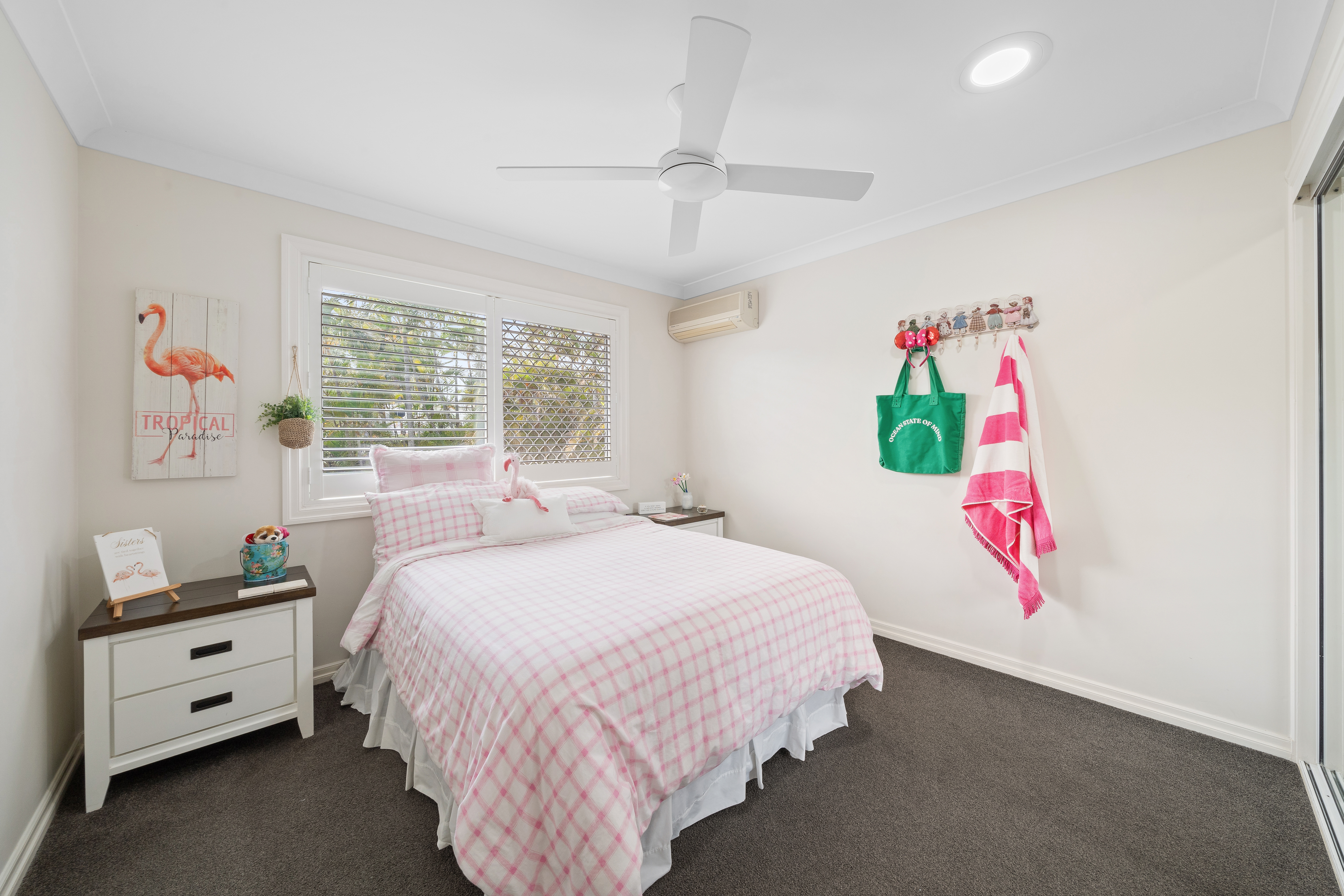 > Bedroom 2, located on the entry level, enjoys high ceilings, oyster lighting, plush carpet flooring, built-in wall shelving, and a sash window with security screens and plantation shutters. > Bedrooms 3 and 4, located on the top level, feature Daikin split-system air conditioning, ceiling fans, downlighting, plush carpet flooring, built-in mirror-fronted robes, and sliding windows with security screens and plantation shutters. > Bedroom 5, located on the top level, features a ceiling fan, downlighting, plush carpet flooring, a built-in mirror-fronted robe, and sliding windows with security screens and plantation shutters. > Bedroom 6, located on the top level, features a ceiling fan, oyster lighting, plush carpet flooring, a built-in mirror-fronted robe, and sliding windows with security screens and plantation shutters.