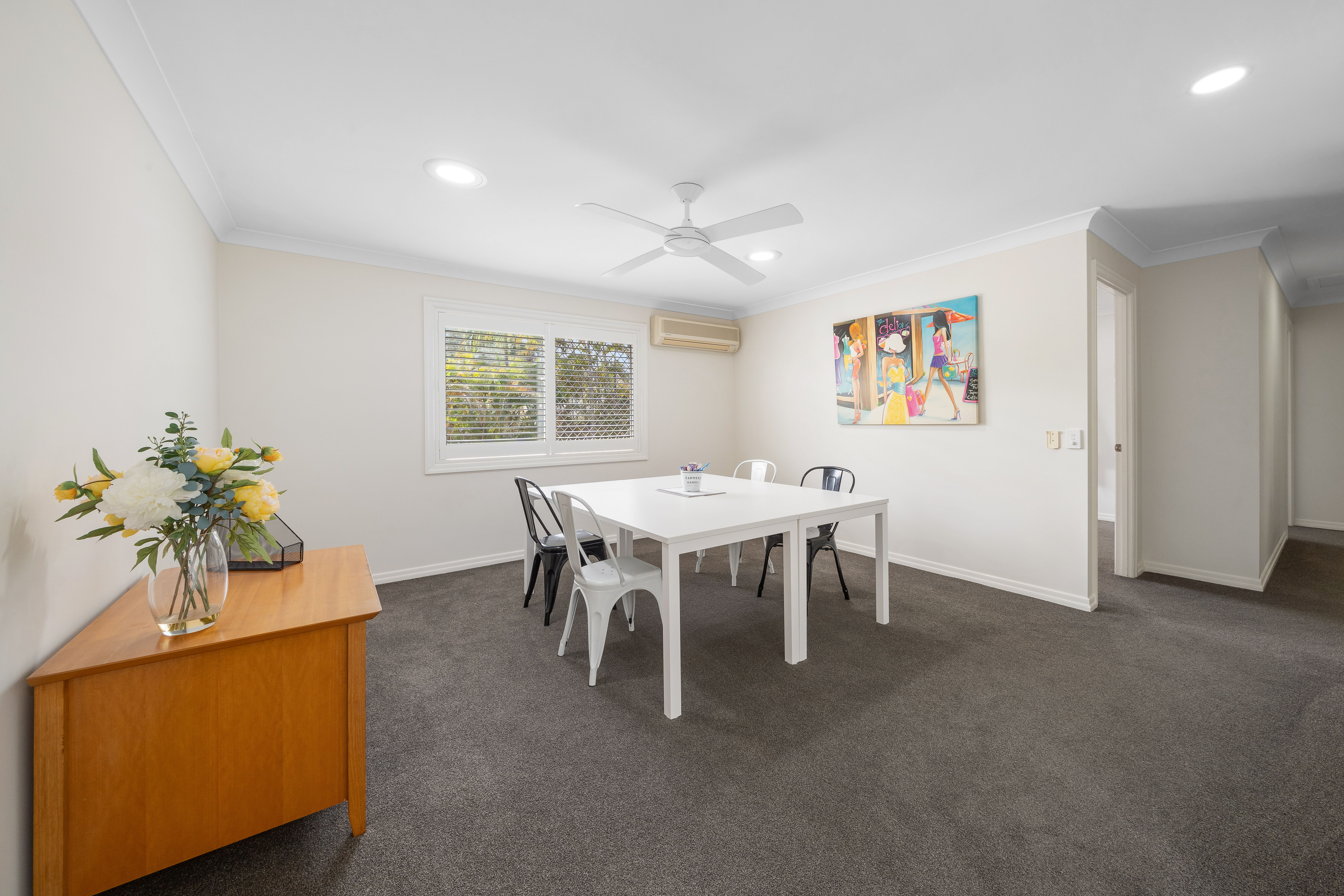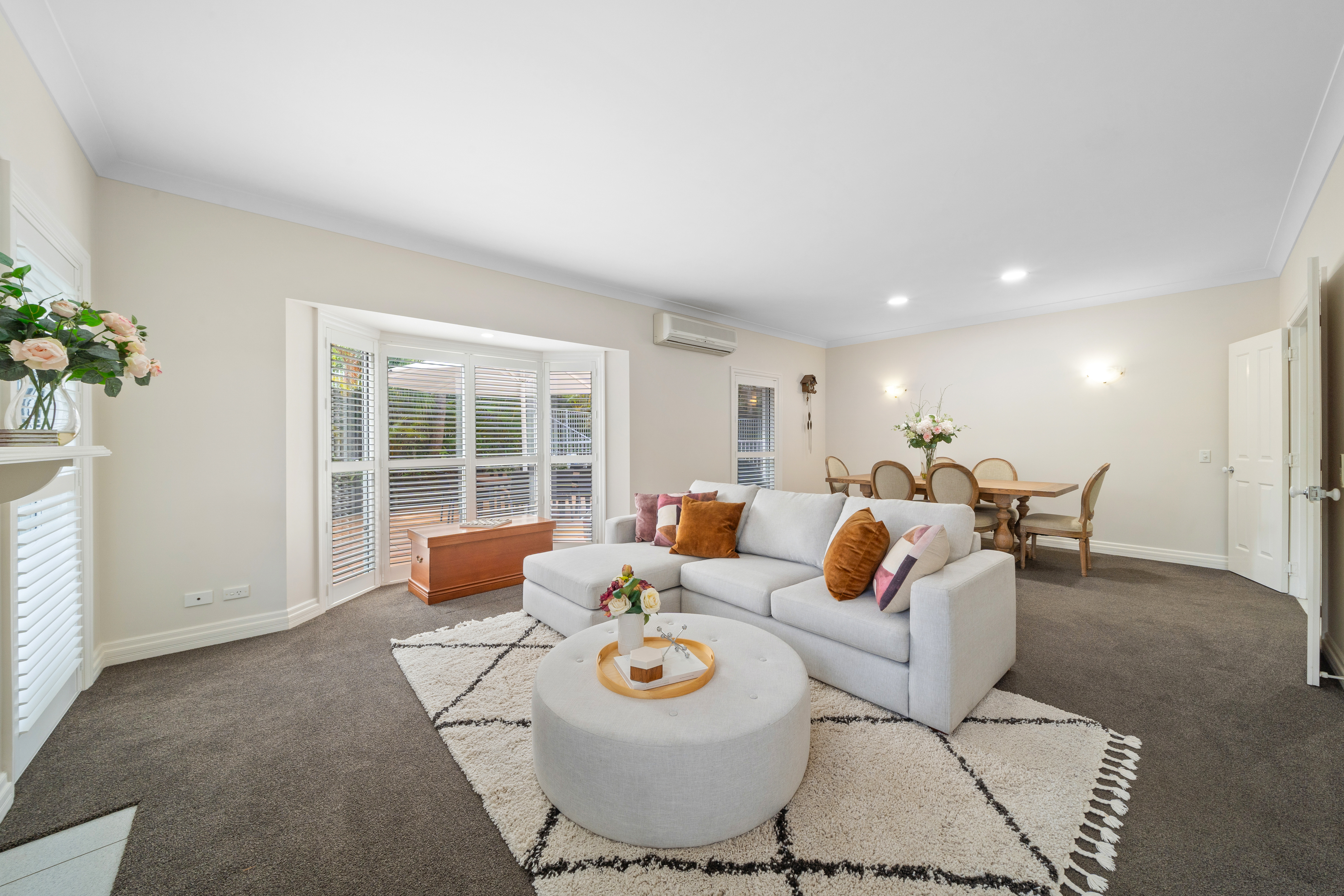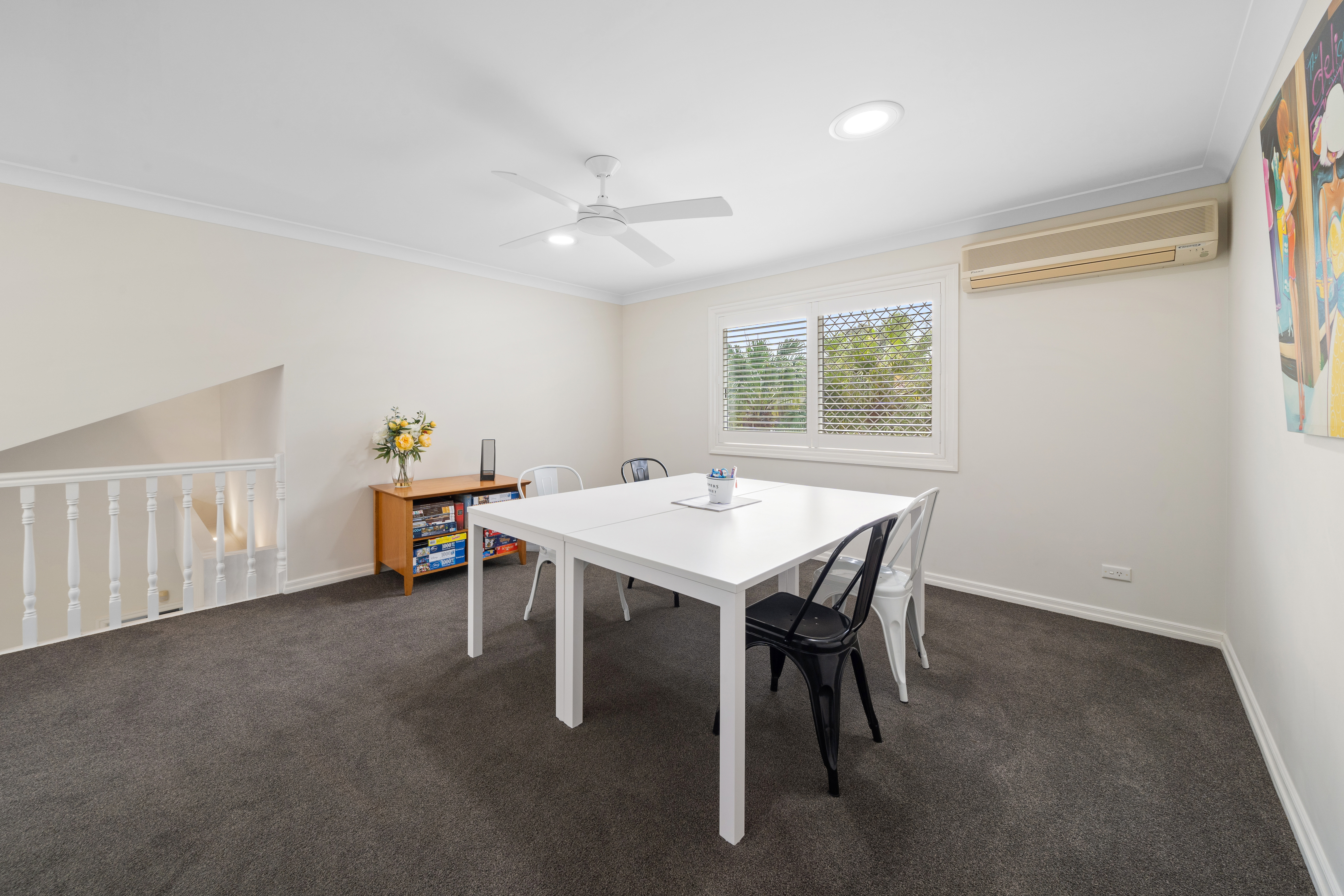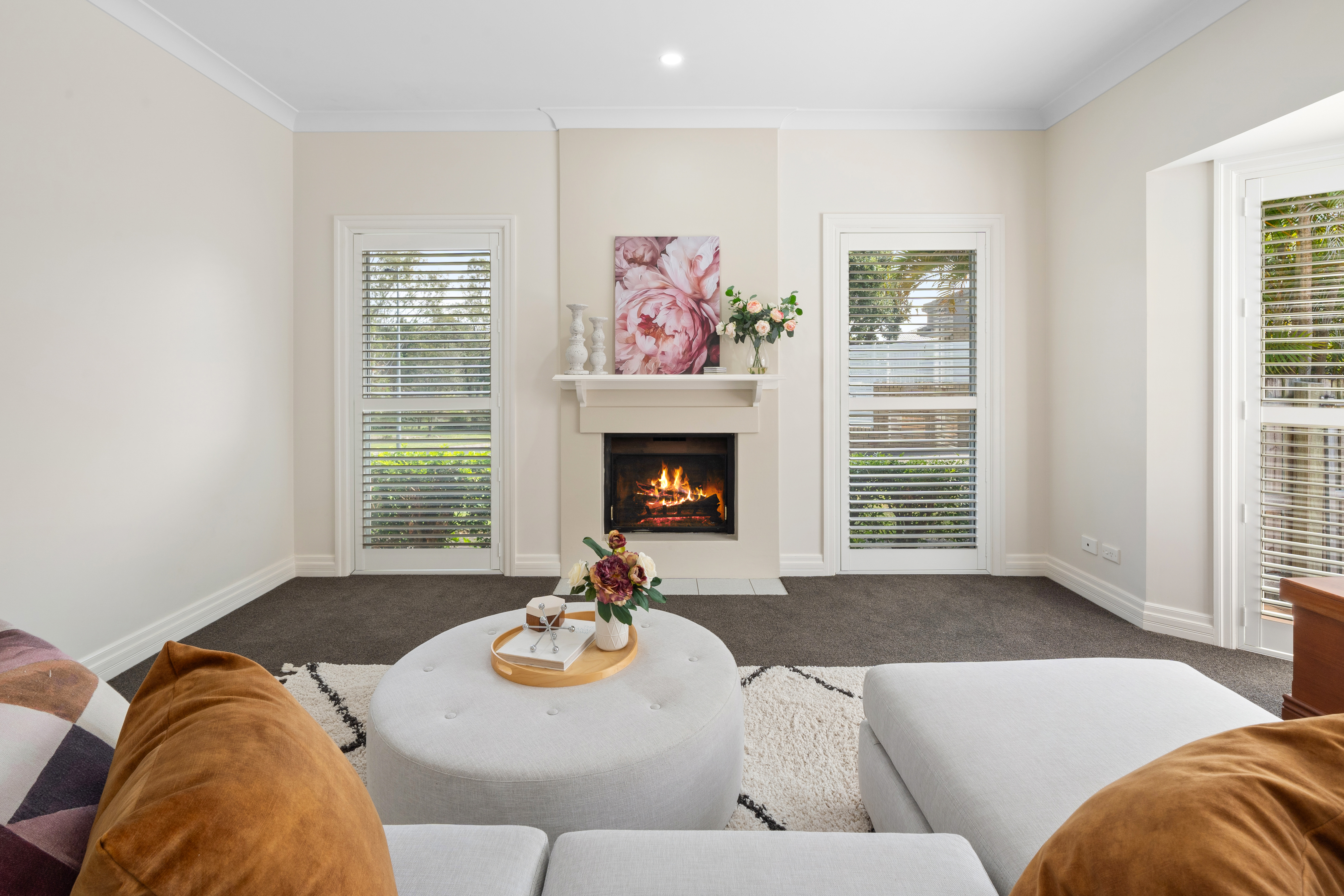 - A multitude of living spaces: > Located at the front of the property is the large lounge/dining room, boasting a working fireplace, plush carpet flooring, Fujitsu split-system air conditioning, sconces as well as downlighting, and sash bay windows with security screens and plantation shutters. > Located at the rear of the property is the large living room featuring Mitsubishi split-system air conditioning, tiled flooring, downlighting, plantation shutters, sliding windows and doors with security screens, giving you access to the outdoor entertaining area and yard. > Located on the top level is the retreat, featuring plush carpet flooring, downlighting, Daikin split-system air conditioning, a ceiling fan, sliding windows with security screens, and plantation shutters.