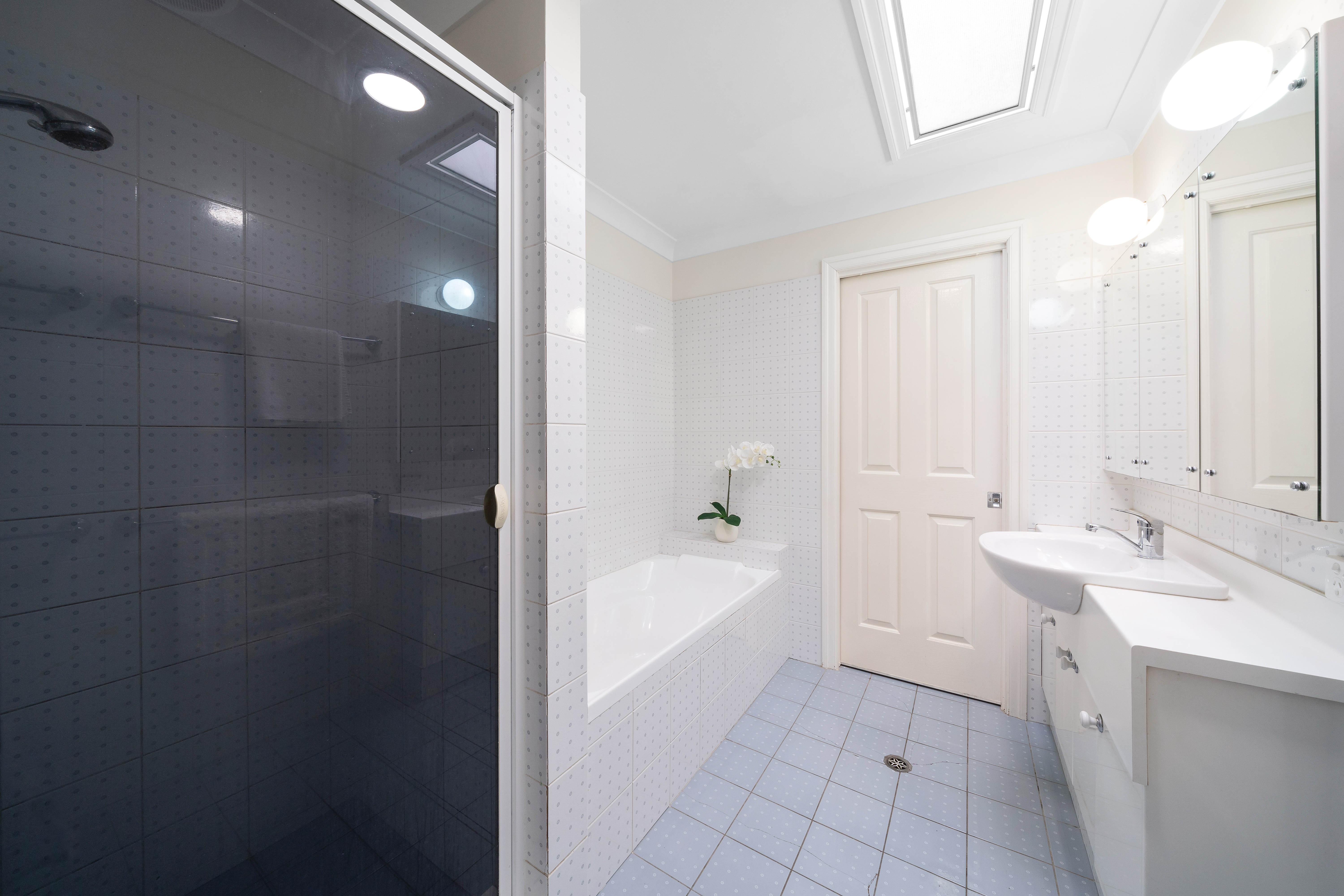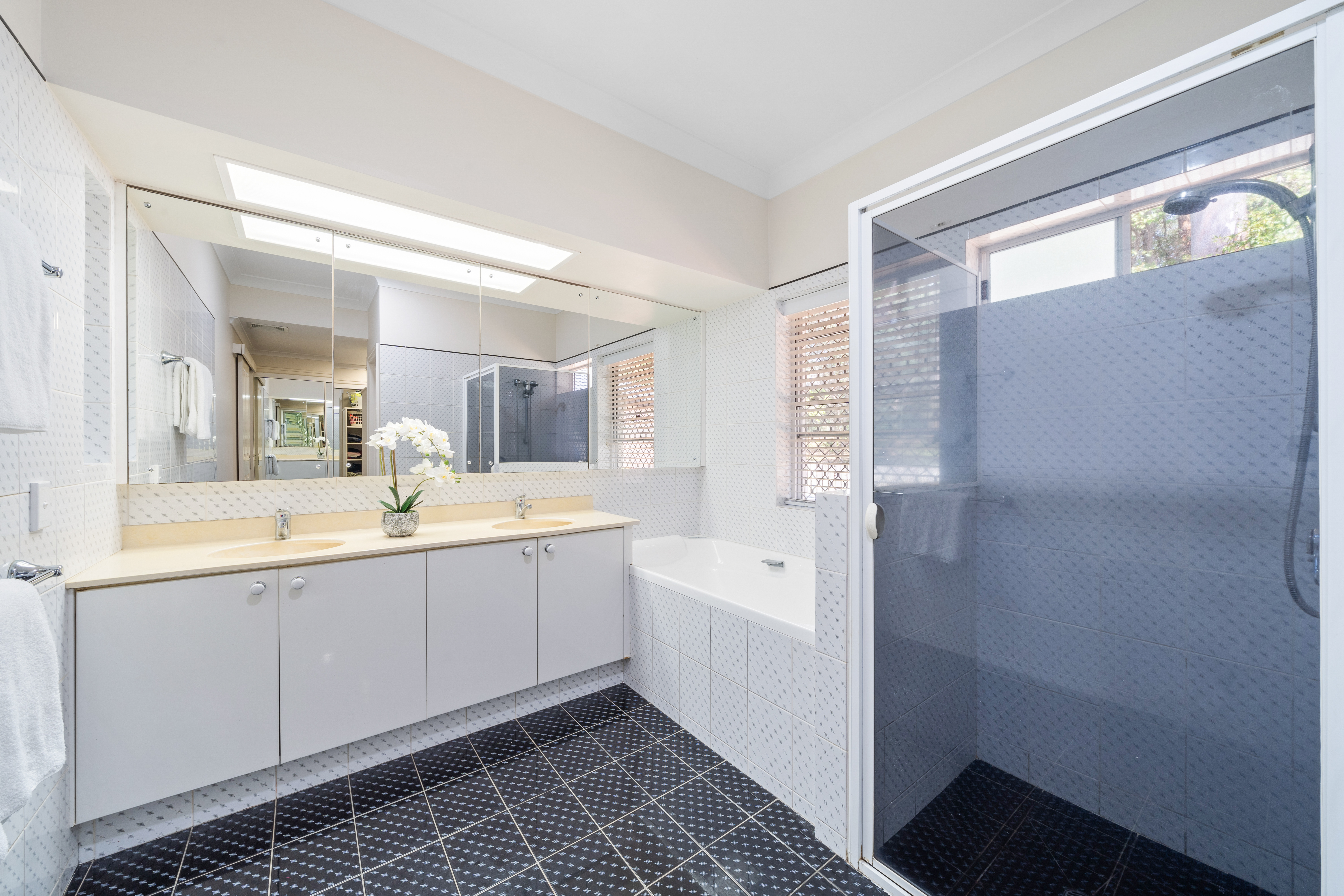 - 2.5 bathrooms: > The ensuite to the master features a shower with a separate bath configuration, a large double basin vanity with plenty of storage, towel racks, a large vanity mirror-fronted cabinet, an extractor fan, vanity and standard lighting, a sliding window with security screens, and a separate toilet. > The main bathroom, located on the top level, features a shower, a separate bath configuration, a single basin vanity with plenty of storage, towel racks, a large vanity mirror-fronted cabinet, an extractor fan, vanity and standard lighting, a skylight, and a separate toilet.