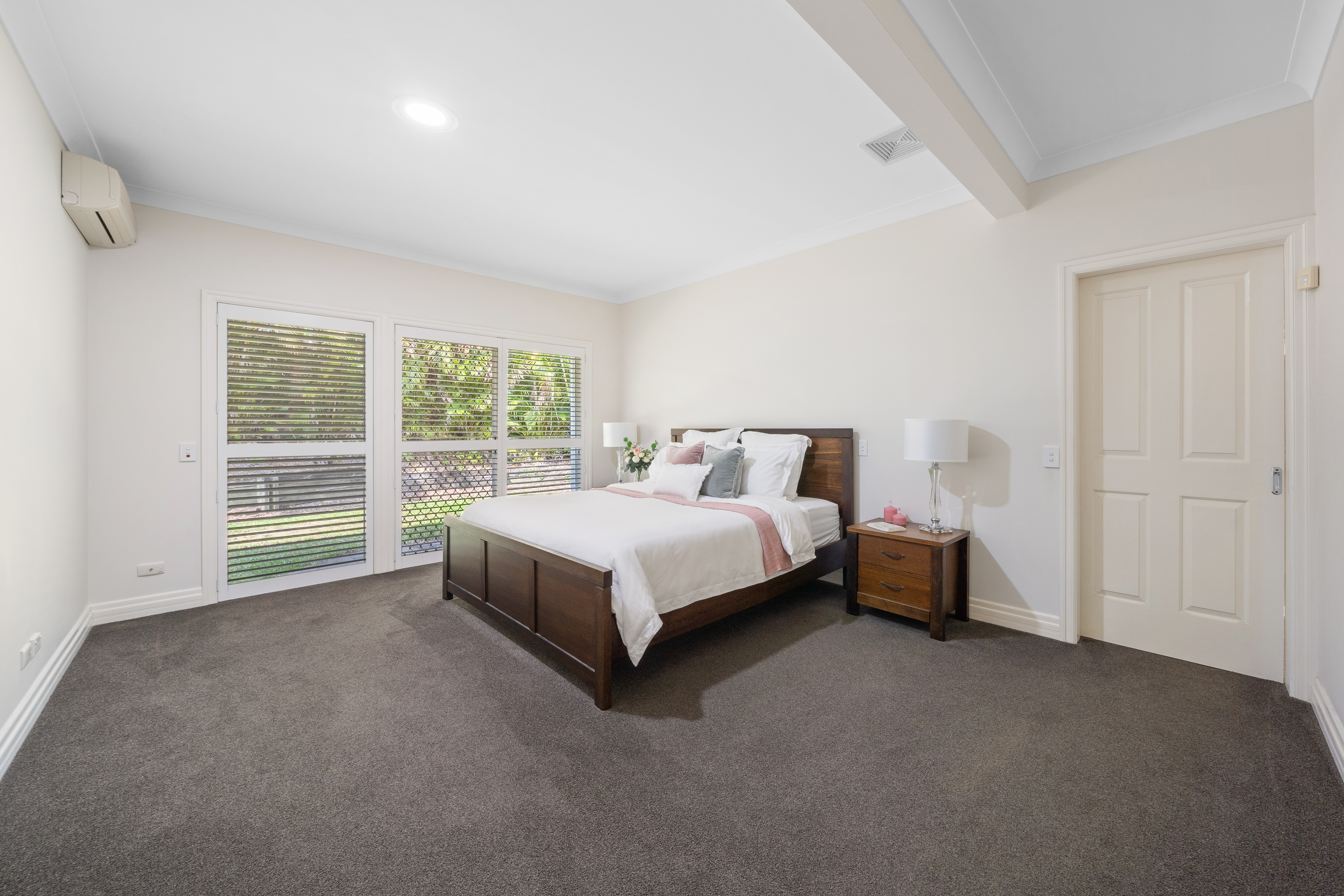 - 6 well-appointed bedrooms: > The palatial master bedroom located on the entry level is perfect for those who enjoy their own space, boasting high ceilings, Daikin split-system air conditioning, plush carpet flooring, downlighting, a walk-in robe, a large ensuite, sash windows, and a sliding door with security screens and plantation shutters, giving you access to the yard.