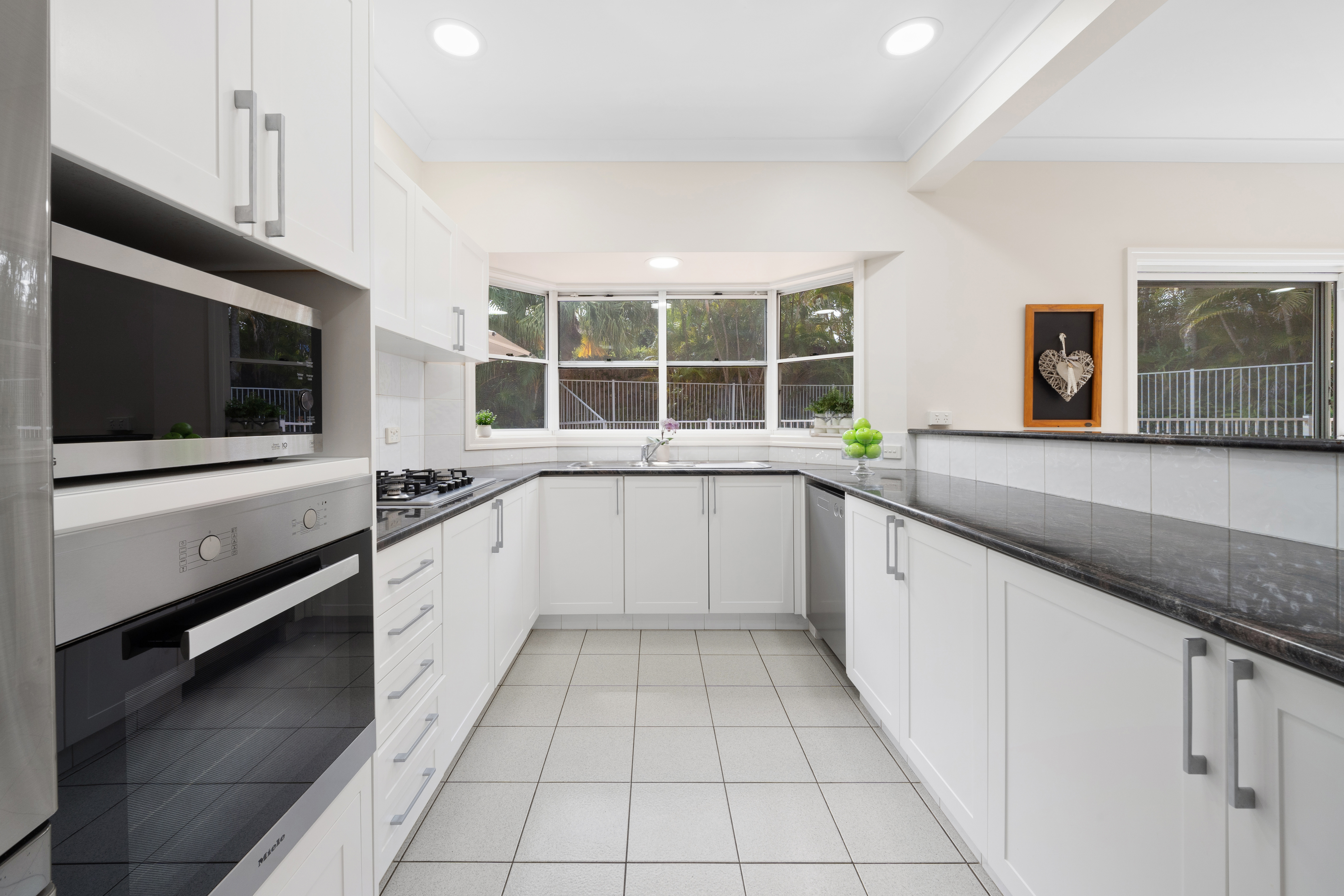 - The kitchen, which joins seamlessly with the main living, dining, and entertaining area, features: > Granite benchtop > Stainless steel 5-burner gas cooktop > Miele 600 mm stainless steel oven